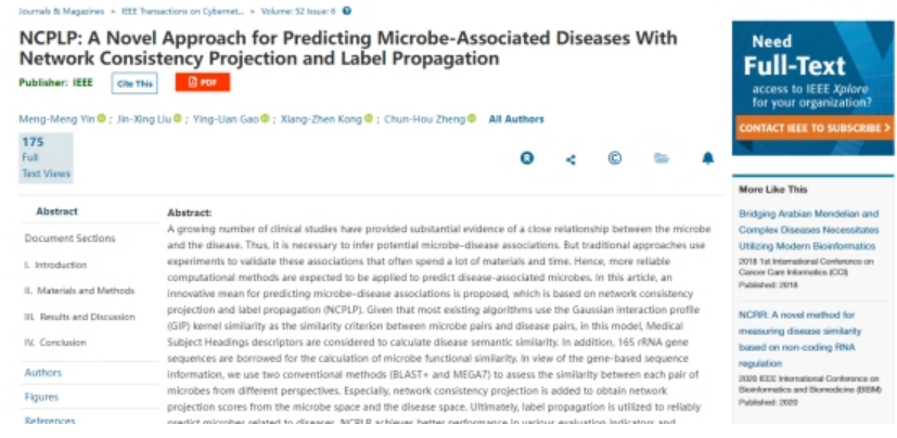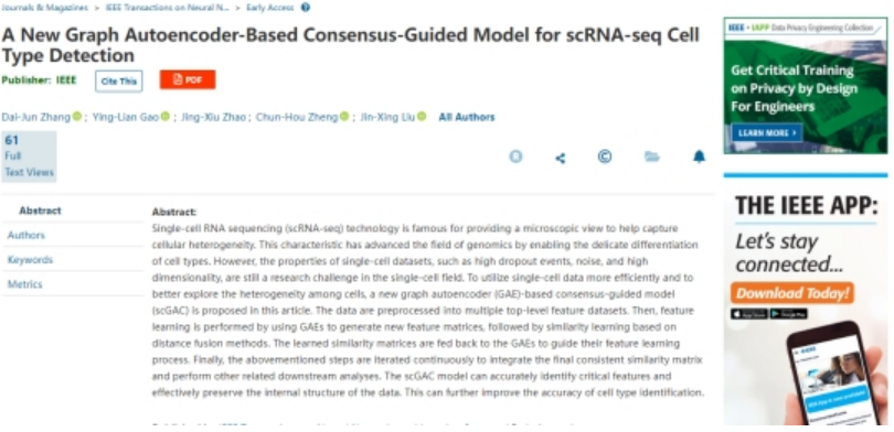 刘金星教授在人工智能领域国际顶级期刊《IEEE Transactions on Cybernetics》(IEEE TCYB)和《IEEE Transactions on Neural Networks and Learning Systems》(IEEE TNNLS)上接连发表题为“NCPLP: A Novel Approach for Predicting Microbe-Associated Diseases With Network Consistency Projection and Label Propagation”,“Predicting miRNA-disease associations through Deep Autoencoder with Multiple Kernel Learning”和“A New Graph Autoencoder-Based Consensus-Guided Model for scRNA-seq Cell Type Detection”论文。曲阜师范大学为论文的第一署名单位,刘金星教授为论文的通讯作者。