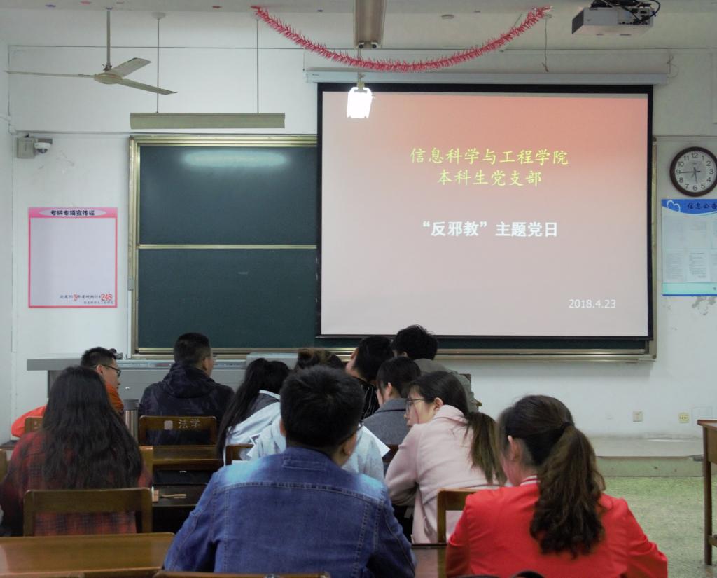 为了使广大基层党组织和党员明确党章党规对基层党组织和党员严禁参加邪教活动的规定要求,深刻认识邪教问题的严重政治危害和反邪教斗争形势的严峻性。2018年4月6日下午5:00,信息科学与工程学院学生党支部全体在c405进行了上一堂反邪教专题党课活动。通过本次活动从使党员政治的高度认清支部和党员在反邪教斗争中应负有的特殊责任,增强党员意识、政权意识、忧患意识,强化团结带领群众共同防范抵御邪教的责任心和使命感。