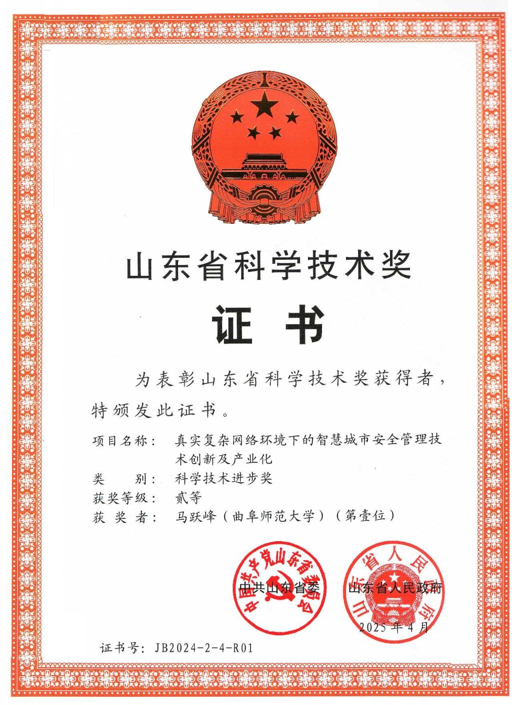图4 山东省科学技术二等奖证书