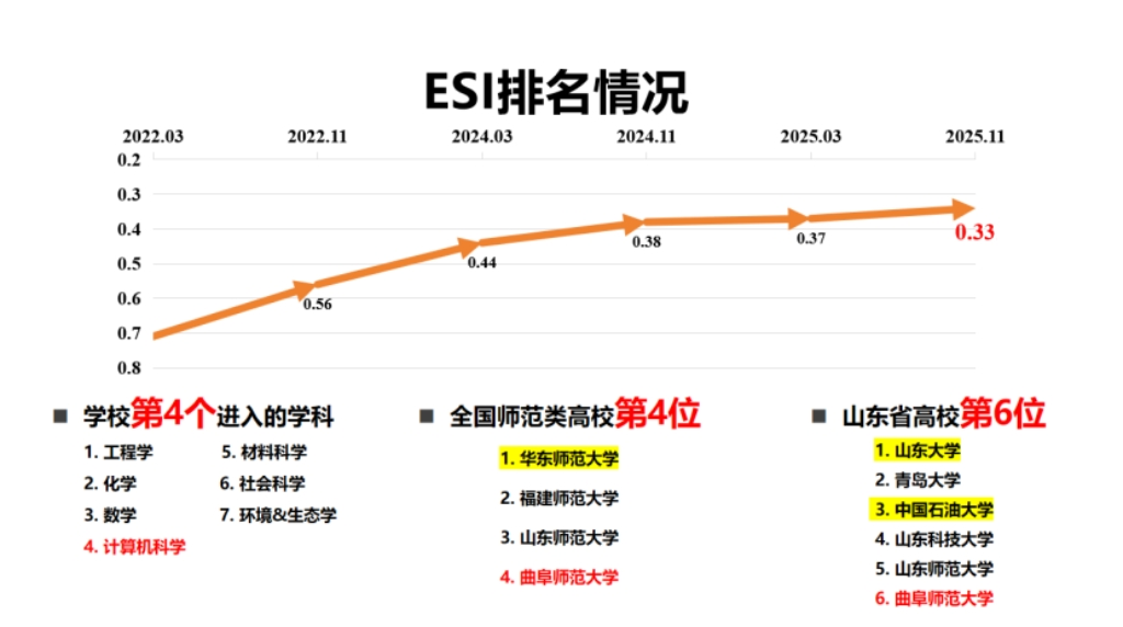 计算机科学学科稳定保持ESI全球前1%,2025年排名百分位提升至0.33,居全国师范类高校第4位,山东省属高校第4位。在2025年软科世界一流学科排名中,人工智能位列中国内地高校第64–90位,计算机科学与工程位列第78–92位(见图2)。
