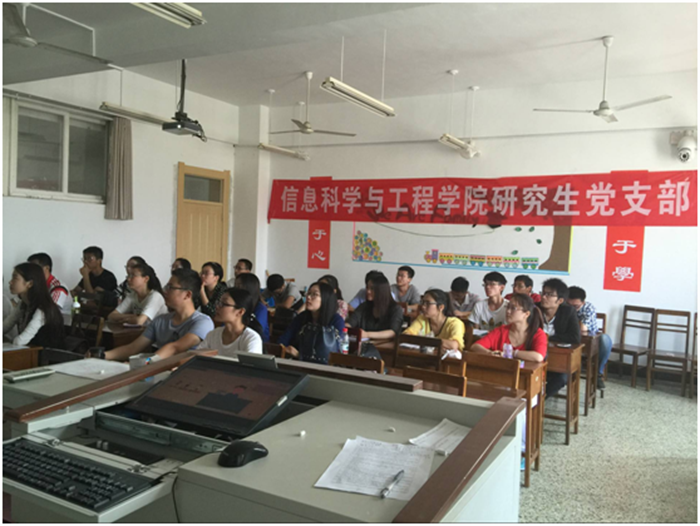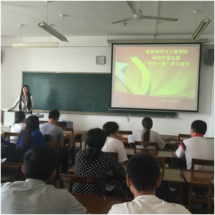 为响应校党委“两学一做”学习教育方案,2016年5月18日上午8:30,信息科学与工程学院研究生党支部第一次集中学习和党课培训在C楼312举行。本次学习活动由研究生党支部副书记张璐同志主持,参加本次学习讨论的有全体研究生党员以及预备党员。