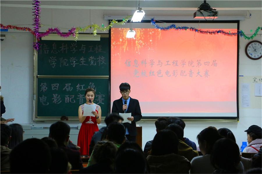 为弘扬红色精神,重温革命历史。信息科学与工程学院红色电影配音大赛于2016年3月26日19:00在C406举行。本次比赛由信息科学与工程学院党校举办,学生会主席团及党校同学观看了本次比赛。