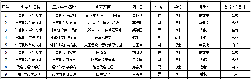 根据曲阜师范大学文件《曲阜师范大学关于印发<硕士研究生指导教师资格审定工作条例>和<博士生指导教师资格审定和聘任工作实施细则>》(校字[2011]22号)和《曲阜师范大学专业学位硕士研究生指导教师资格审定和工作条例》(校字[2012]121号),以及研究生处《关于开展研究生导师增选和考核工作的通知》的要求和规定,本着公平、公正、公开、择优和推进学院研究生培养和导师队伍强化的原则,严格执行学校文件和通知要求,认真验证申请人和考核人成果材料真伪,对存在争议的问题和相关人积极与学校研究生处反映情况。经信息科学与工程学院学位评定分委会讨论和审核,现确定信息科学与工程学院2016年度硕士研究生指导教师期满考核和新导师遴选推荐结果,现予以公示(以二级专业和材料提交时间为序):