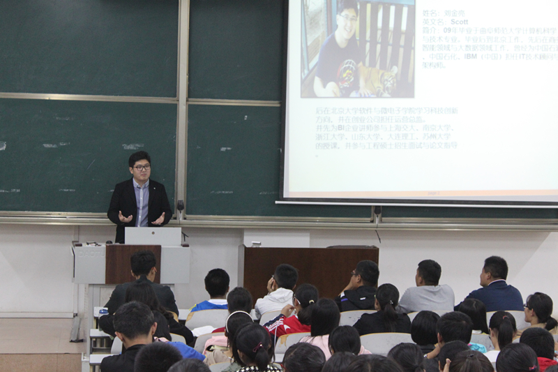 为迎接校庆,加深同学们对计算机行业认识,明确未来发展规划。10月13日19:00,曲阜师范大学信息科学与工程学院于E楼303教室,举行了一场关于计算机行业规划发展的讲座。受信息科学与工程学院辅导员姜振栋老师邀请而来的07级校友刘金亮,现是北京西普科技运营总监兼CEO助理。