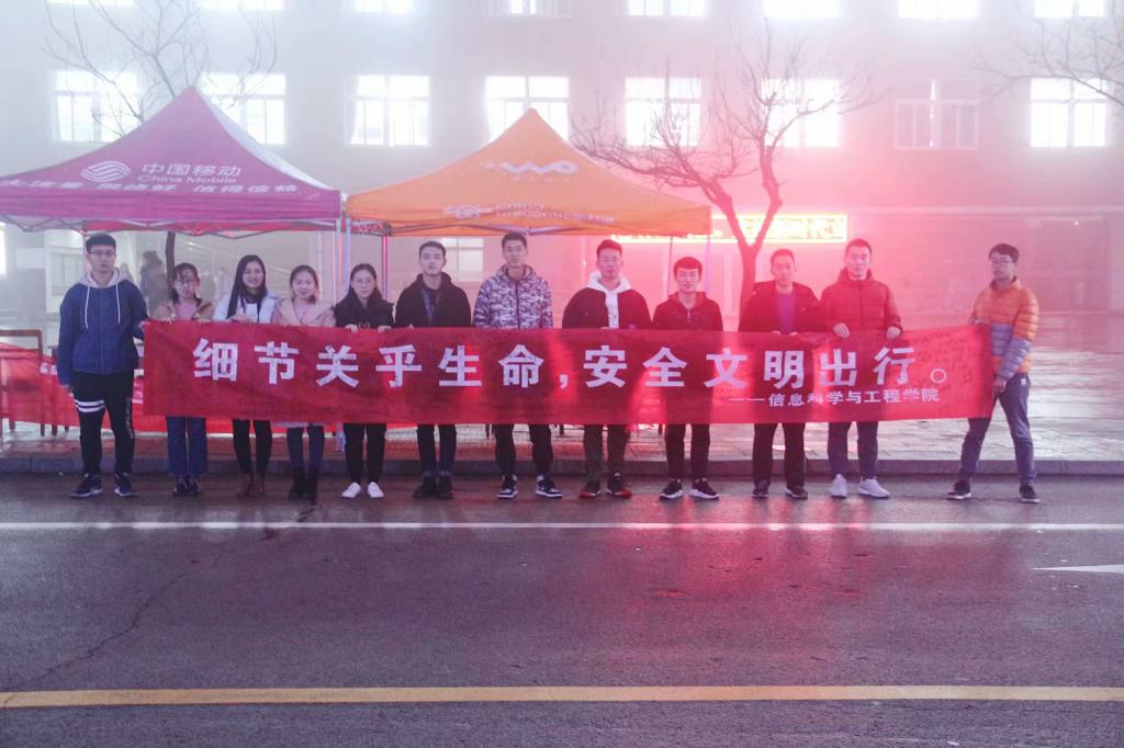2018年12月2日,信息科学与工程学院“安全百日行”系列活动之“全国交通安全日”签名活动于学校北门举行。本次活动由信息科学与工程学院团委学生会安全部主办,信息科学与工程学院党委副书记肖龙航和学生会主席团成员出席了本次活动。
