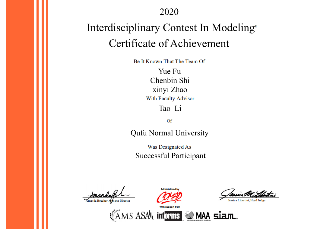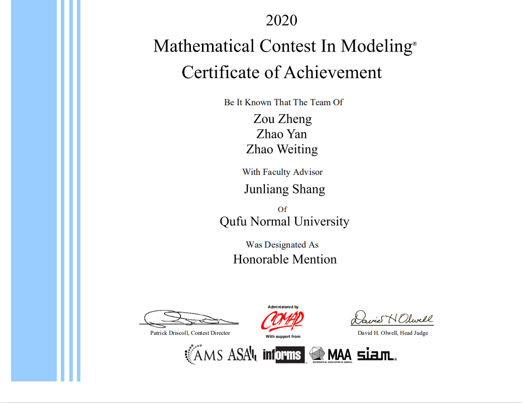 近日,2020年美国大学生数学建模竞赛(MCM/ICM)评选结果正式公布,信息科学与工程学院代表队在这次竞赛中取得了优异的成绩,其中,二等奖(Honorable Mention)5项、成功参赛奖(Successful Participant)6项。