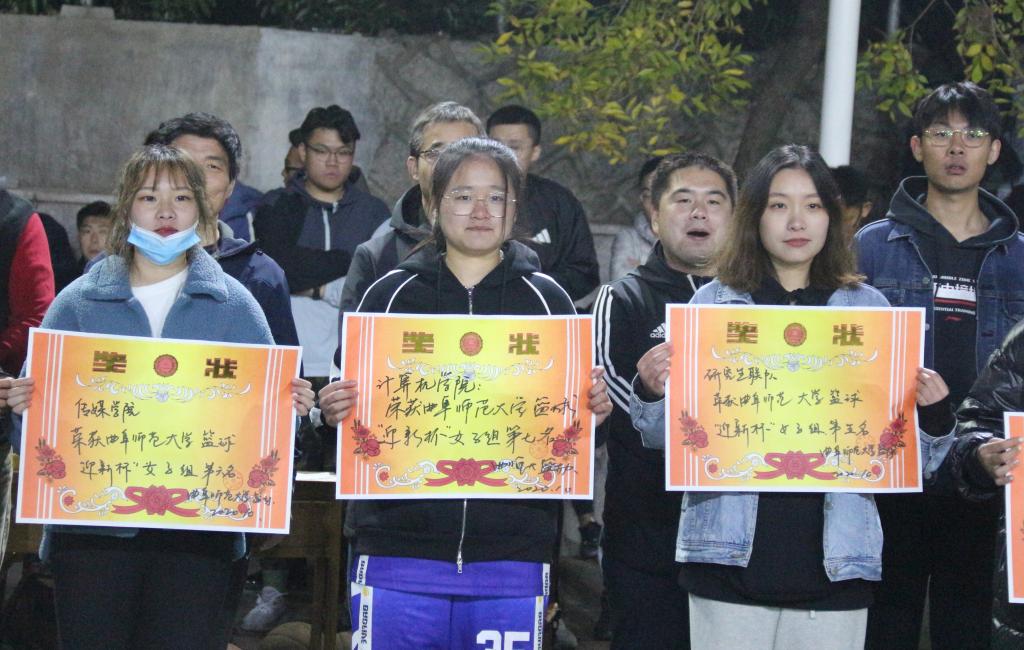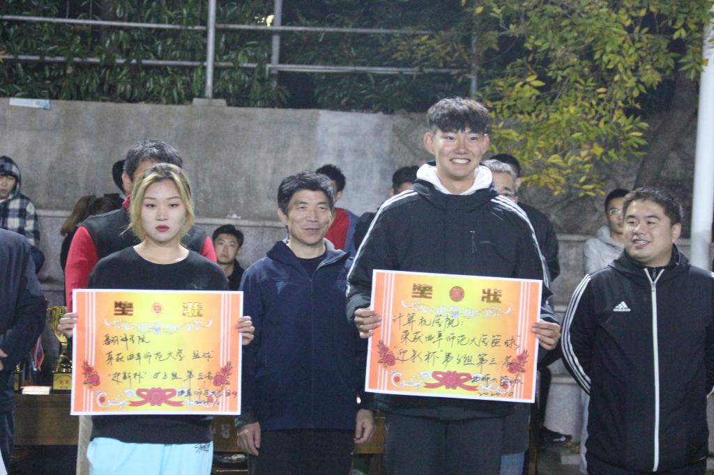 也取得了男篮第三,女篮第七的优异成绩。为激励同学的篮球热情,向在本次比赛中表现优异的队伍与个人予以鼓励,“迎新杯”闭幕式于东操隆重举行。我院辅导员纪玉超与其他学院辅导员、体育教学部老师出席并担任颁奖嘉宾,各学院男女篮代表队参加本次闭幕式。