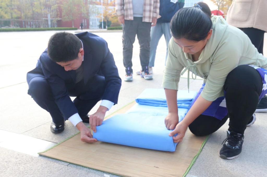 于日月广场成功举办叠被子大赛。学工处、武装部副部长赵秀臣、av大平台
