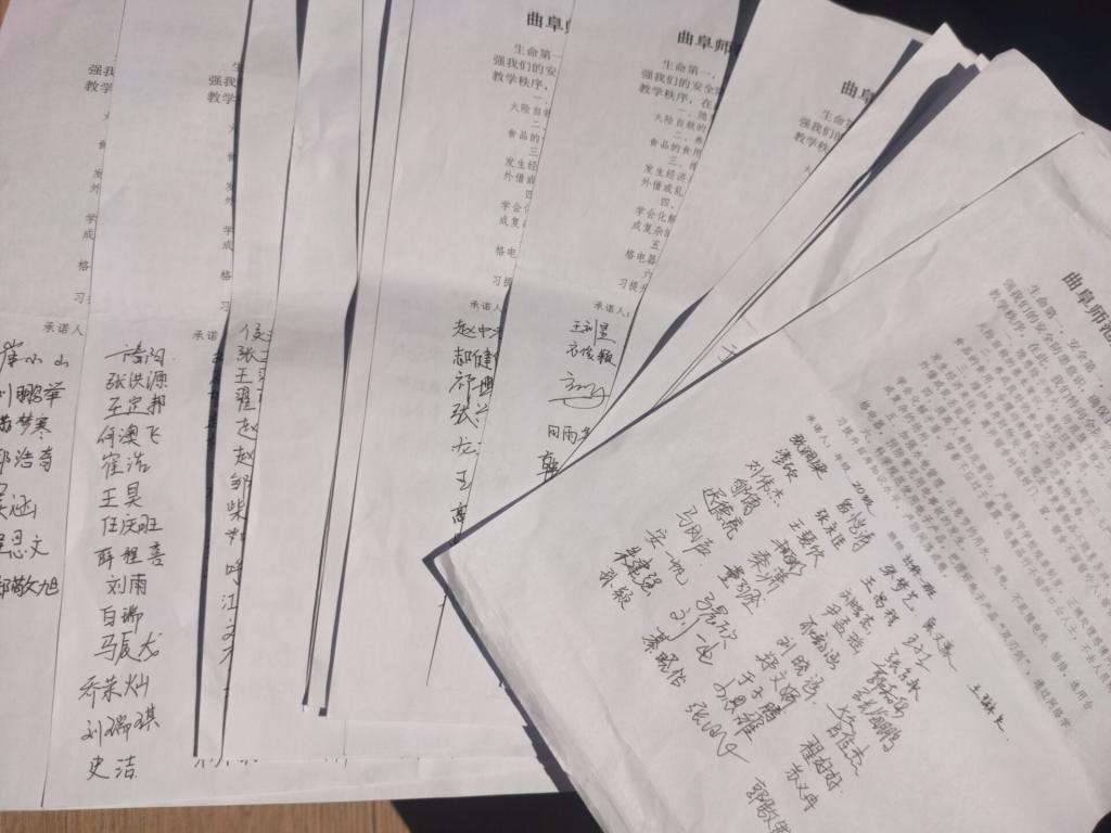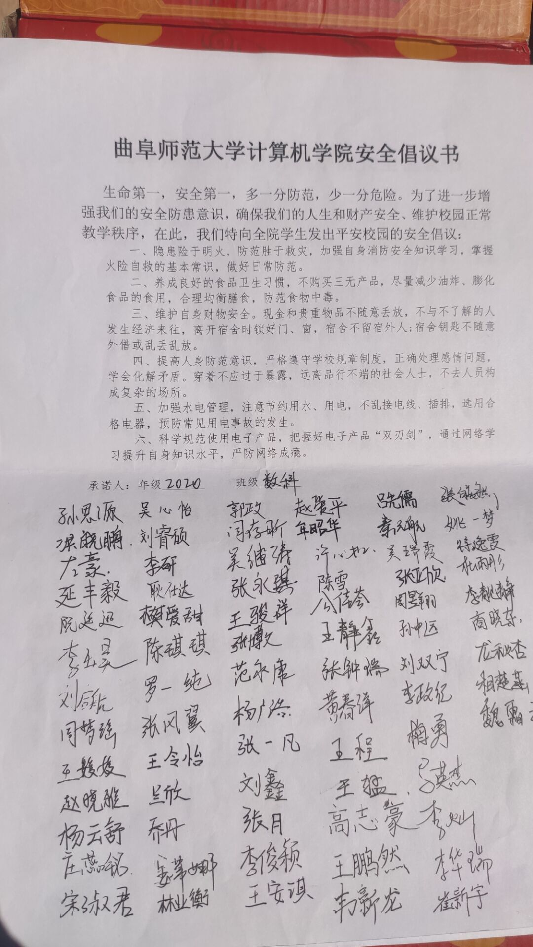 “校园安全”主题系列教育活动初期,各班开展事故警示教育主题班会,由各班安全委员召开班会并组织观看与安全相关的节目,通过观看视频形式向同学们介绍校园周边的安全隐患和校园安全常识,让同学们学到很多安全知识,并认识到在日常生活中防患于未然的重要性,使同学们通过自我思考,自我剖析,结合自身经历,认识到自己在安全防范方面存在的不足,从而加强自我防范意识和自我约束力,提高同学们的安全防范能力。4月15日,我院组织同学们进行安全承诺书签名,该承诺书包含消防安全、食品安全与营养健康、交通安全、宿舍防火、防盗、人身防护、用水用电安全以及科学规范使用电子产品等方面,各班安全委员带领班级同学认真阅读该承诺书的各项守则并签名,督促同学们保证个人人身安全,维护正常的工作和生活秩序,提高个人安全意识及警惕性。