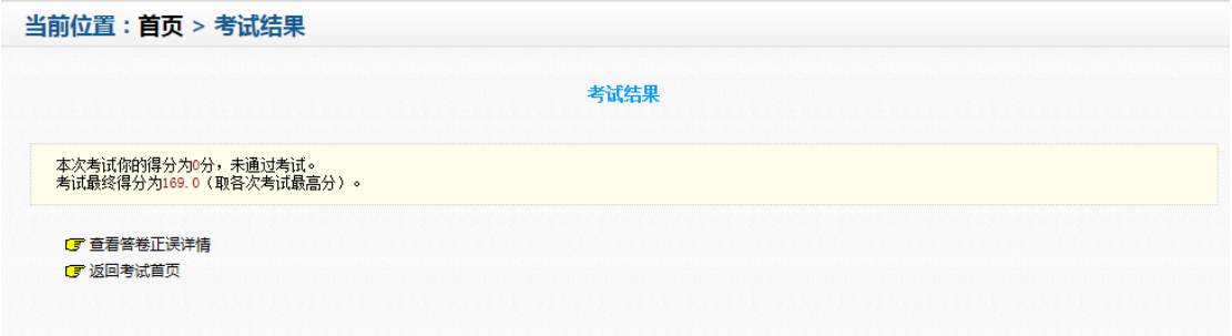 8、显示考试结果即为考试顺利结束,随即方可查看正误详情、返回考试av大平台再次考试或关 闭页面