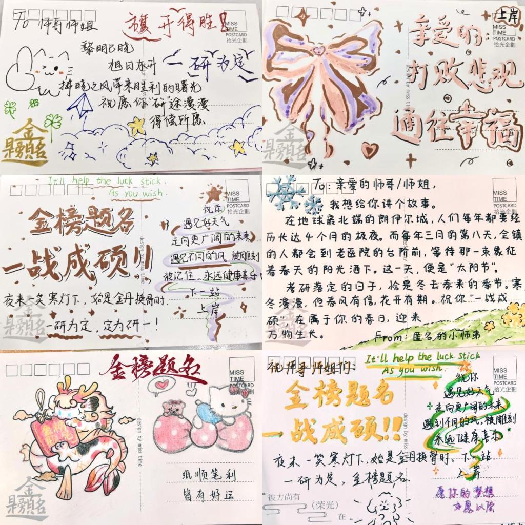 学院精心准备了“考研加油包”:“一战成硕”的甜美橙子、“运气旺旺”的旺仔牛奶,以及师弟师妹们亲手书写的祝福卡片。每一份小礼物都承载着全院师生最真挚的期盼——心有所向,一“研”为定,成功上岸!同学们纷纷表示,这份“带着温度的礼物”,让备考的疲惫消解了不少,也让奔赴考场的脚步更有力量。