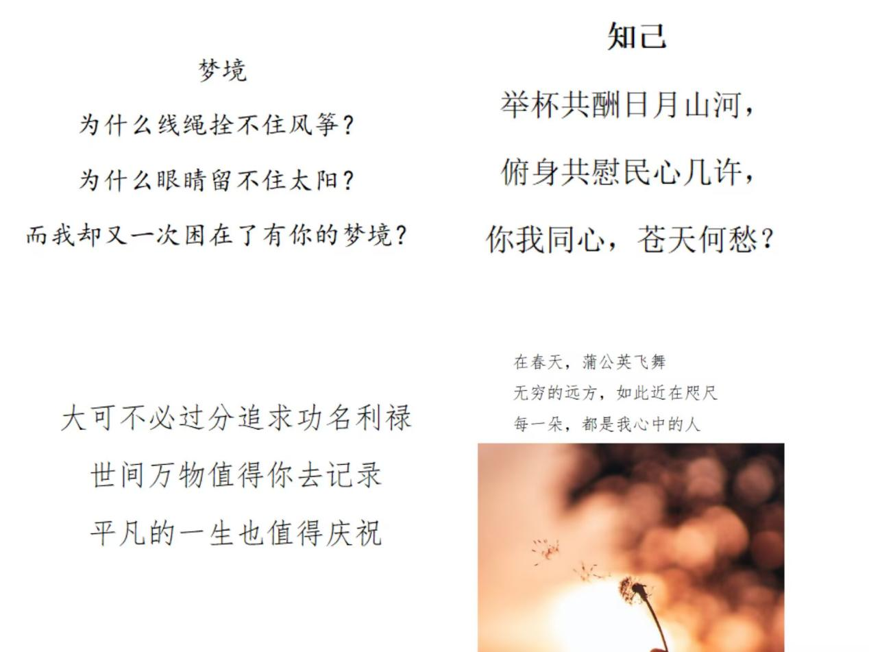 同学们化身校园里的“诗意捕手”,以敏锐的视角和细腻的笔触,从平凡的日常里找寻灵感的碎片。每一行诗句,都是他们对生活的一次深情凝视,在平凡中挖掘不凡;每一次提笔,都是心灵深处的一次旅行,让情感在文字间肆意流淌。这些诗作,不仅是文字的组合,更是青春的印记,记录着校园里的思考、梦想与感动。