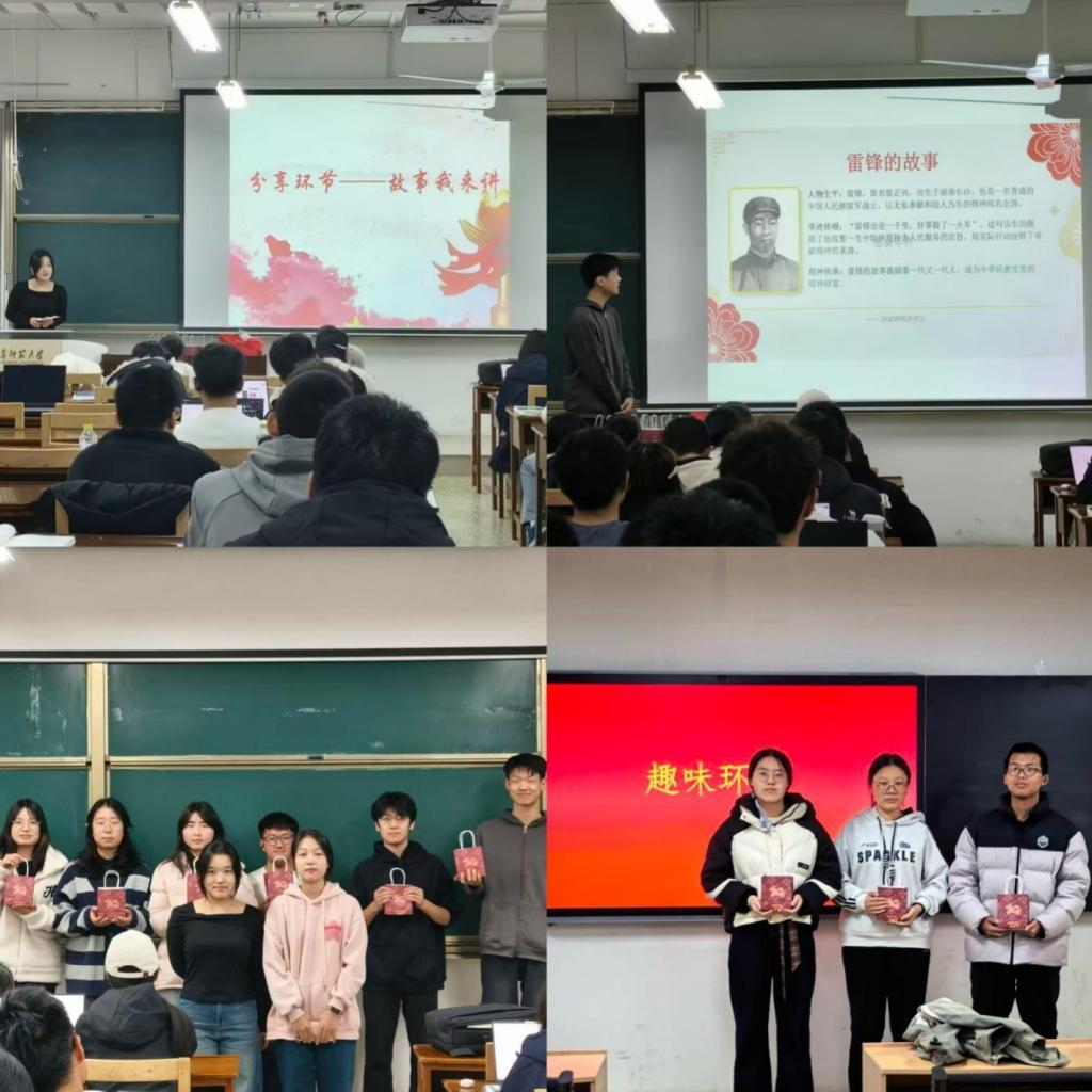 在互动环节,同学们积极参与“猜红歌”“猜电影片段”等趣味活动,进一步加深了对雷锋精神与黄河治理历程的了解与共鸣。活动尾声,班委们作简短总结,号召大家从身边小事做起,以实际行动传承精神、勇担使命,并为所有分享者颁发了纪念奖品。