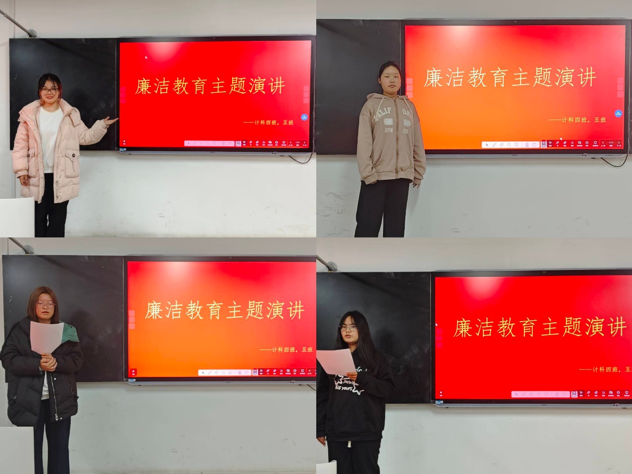11月10日,计科四班、五班举办“清风扬正气,廉洁伴我行”主题演讲比赛,六名参赛选手从不同的角度诠释了廉洁文化的内涵,强调廉洁对个人和社会的深远影响。人工智能班召开“坚守廉洁心,杜绝微腐败”主题会议,由各班委依次上台分析廉洁反腐的正反案例,深刻理解廉洁素养和社会正义感的重要性。此外,计科二班、三班各班代表以饱满的热情讲述从古至今的廉洁文化,鼓励大家从小事做起。