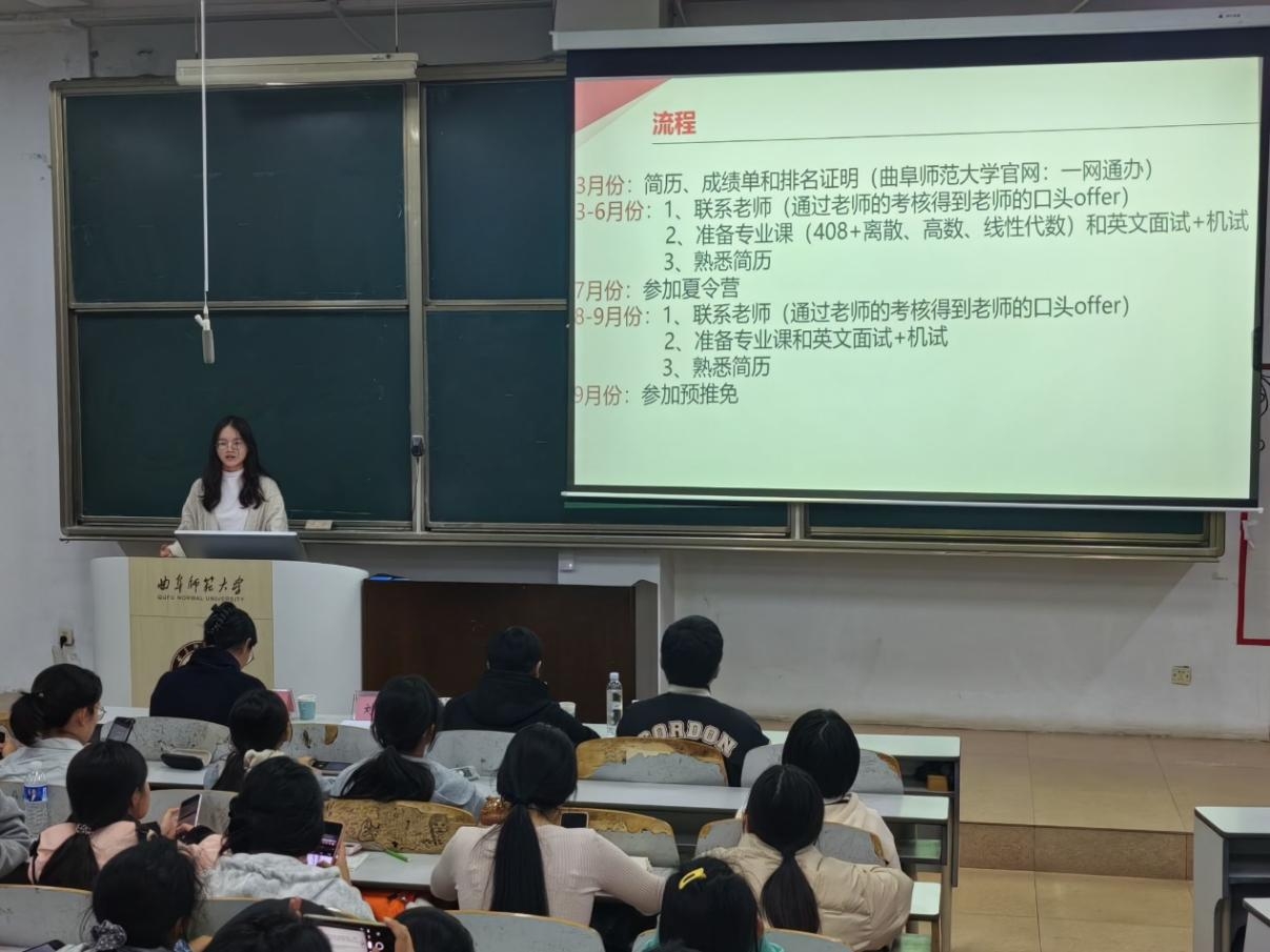 会议伊始,盛亚堃结合自身经历,介绍了推免政策、竞赛的帮助和校内名额限制等,强调推免不是唯一出路,兴趣为第一要素。接着刘思语分享了自己的学习经验,详细地介绍了保研流程、夏令营的预推免情况等,建议同学们要做好前期准备。
