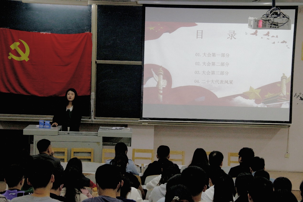 首先,本科生党支部书记孙宇从党的二十大报告主题、二十大召开的重要意义以及报告内容等方面进行了详细、系统的讲解,重点针对过去五年的工作和新时代十年的伟大变革、党的初心使命、详细解读了党的二十大精神的丰富内涵和核心要义。接着,孙宇书记向支部党员展示了二十大代表风采,带领大家学习人民英雄的优秀品质和精神风范,并结合实际对与会党员学习贯彻党的二十大精神提出了要求。