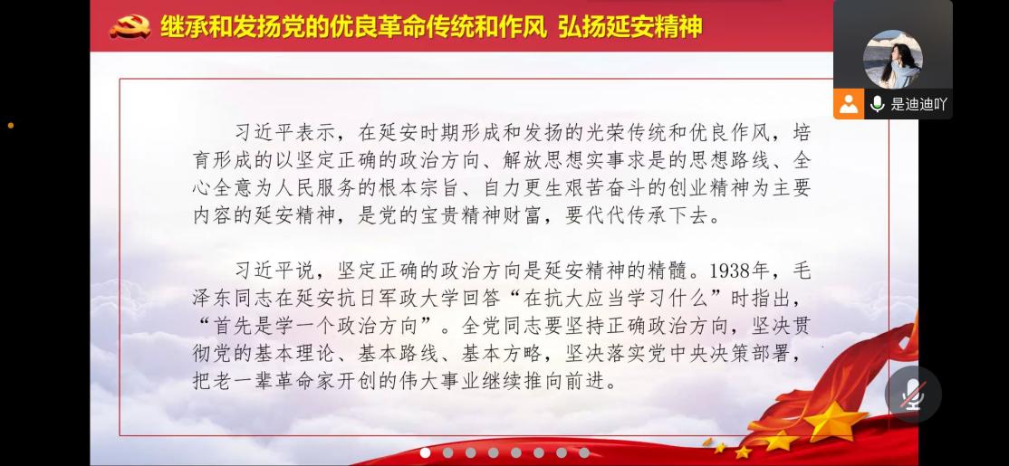 党课最后,焦迪指出希望各位党员在生活中牢记延安精神,继承与发扬党的优良传统,赓续红色血脉,真正的提高自身本领。