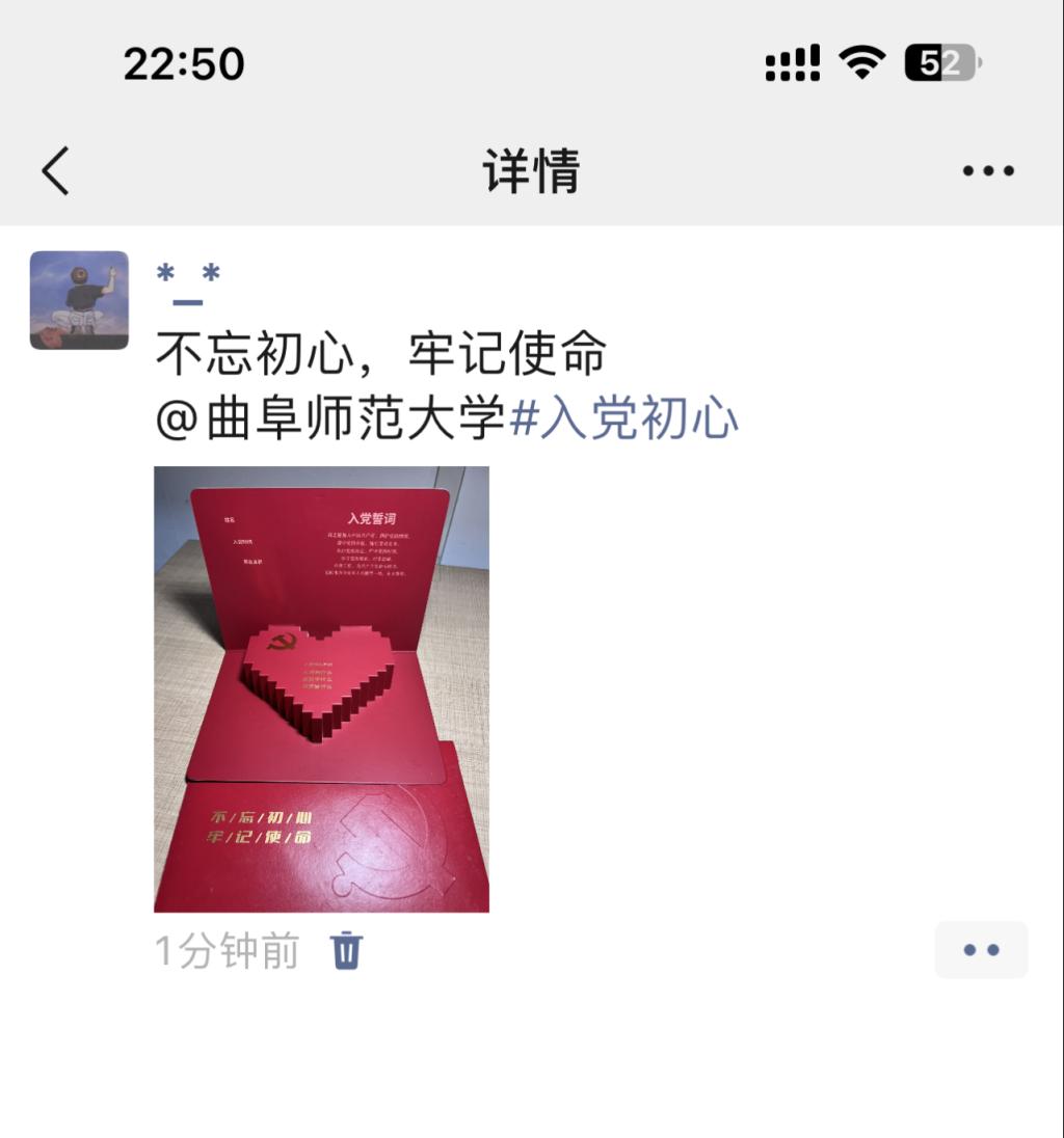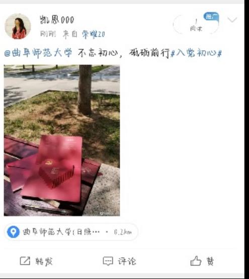 学院鼓励学生党员将发下的“初心卡”放置于校园风景中或宿舍生活场所等地,拍照后将照片发布到自己的微博或朋友圈,并且在发布时艾特曲阜师范大学,发表不忘初心,牢记使命等相关感言。