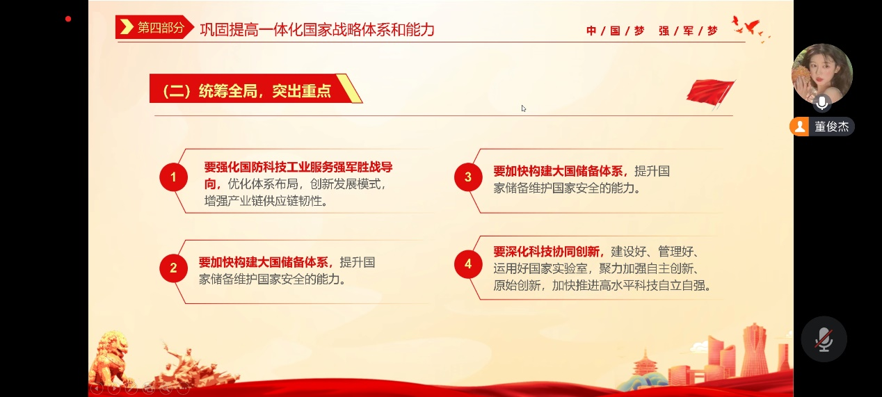 本科生党支部召开主题为《加快把人民军队建成世界一流军队》的线上学习党日活动,会议由分党校秘书长董俊杰主持,全体党员参加。