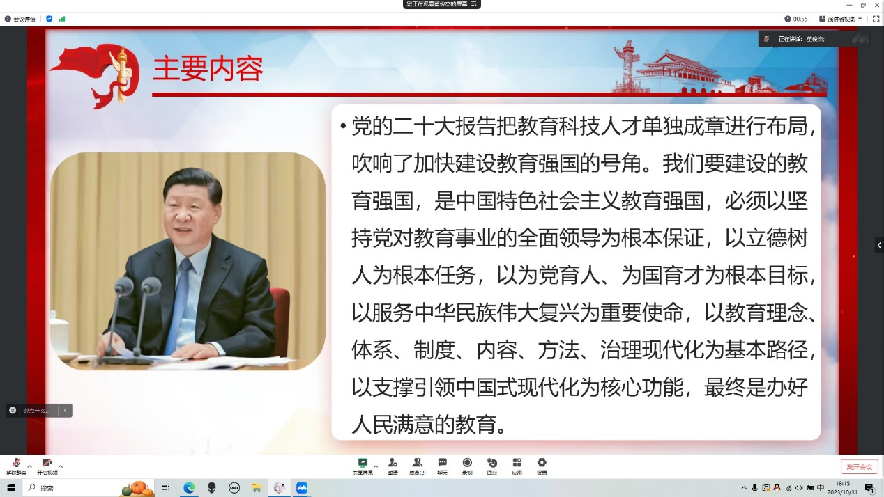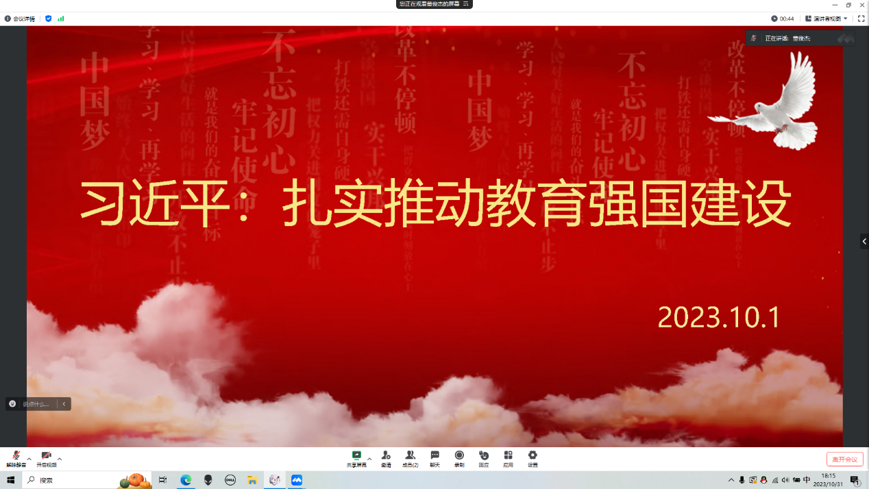 2023年10月21日,av大平台 本科生第一、第二、第三党支部在腾讯会议开展以“扎实推动教育强国建设”为主题的党日活动,会议由分党校秘书长董俊杰主持,全体党员参加。