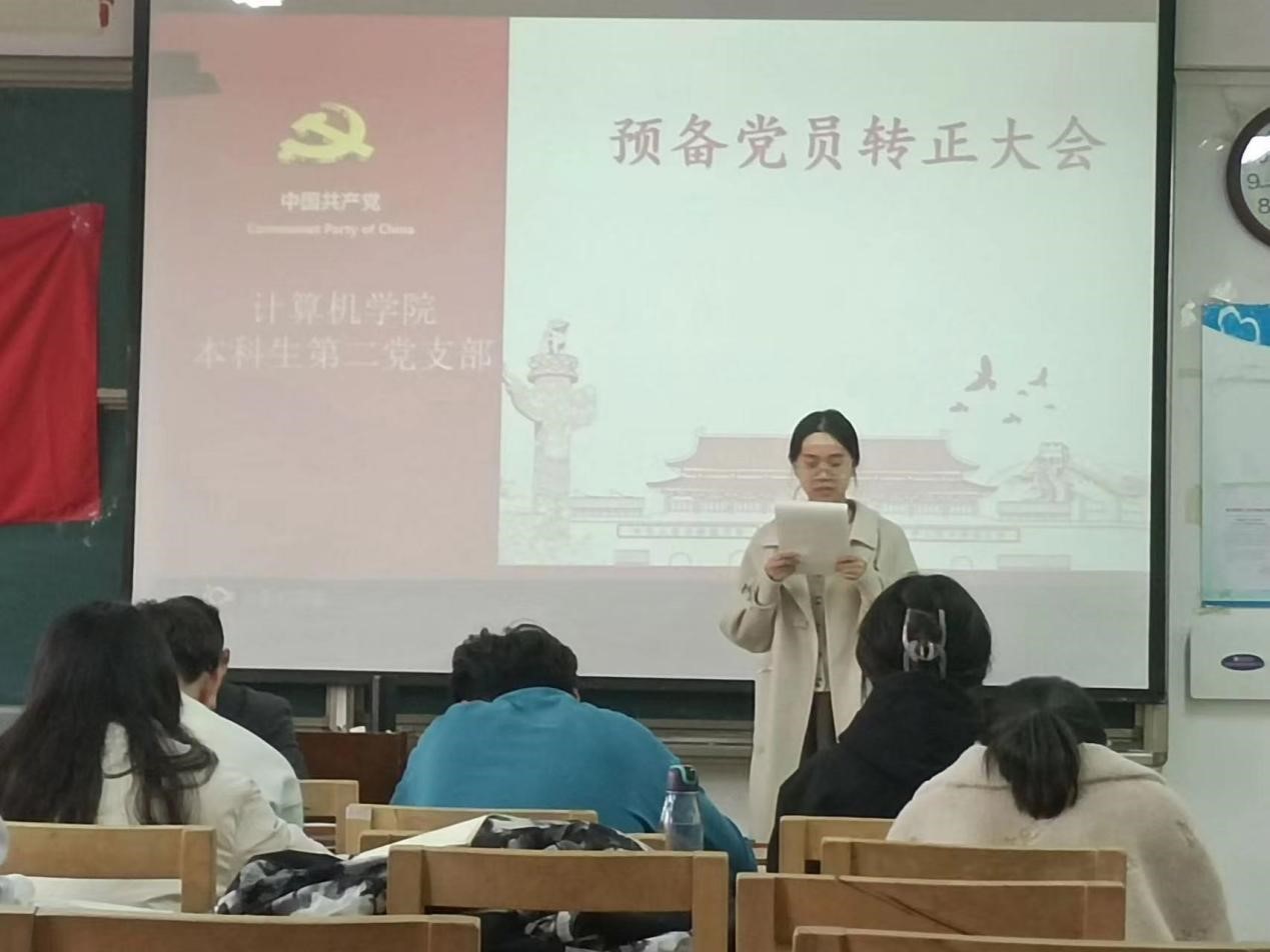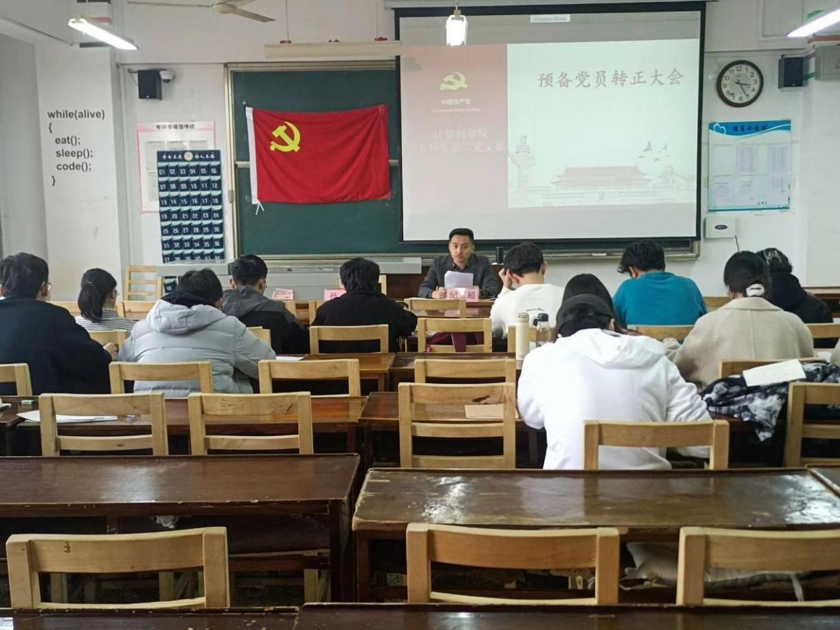2023年11月27日下午,av大平台 本科生第二党支部于JC407召开预备党员转正大会。本科生第二党支部全体党员参加此次会议。会议由本科生第二党支部书记孙宇主持。