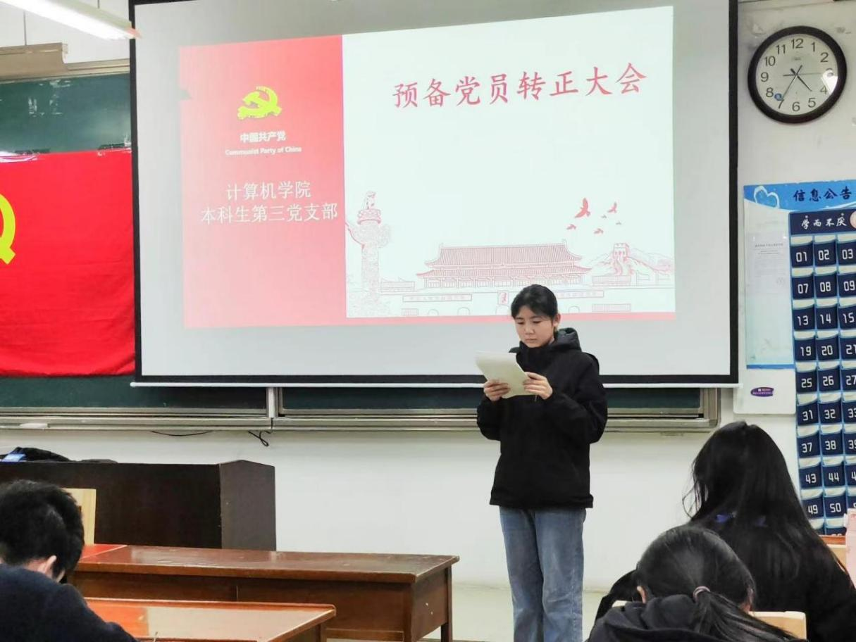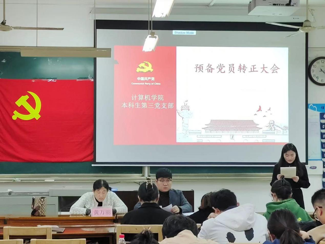 本科生第三党支部于JC408召开预备党员转正大会。本科生第三党支部全体党员参加此次会议。会议由本科生第三党支部书记杨丹丹主持。