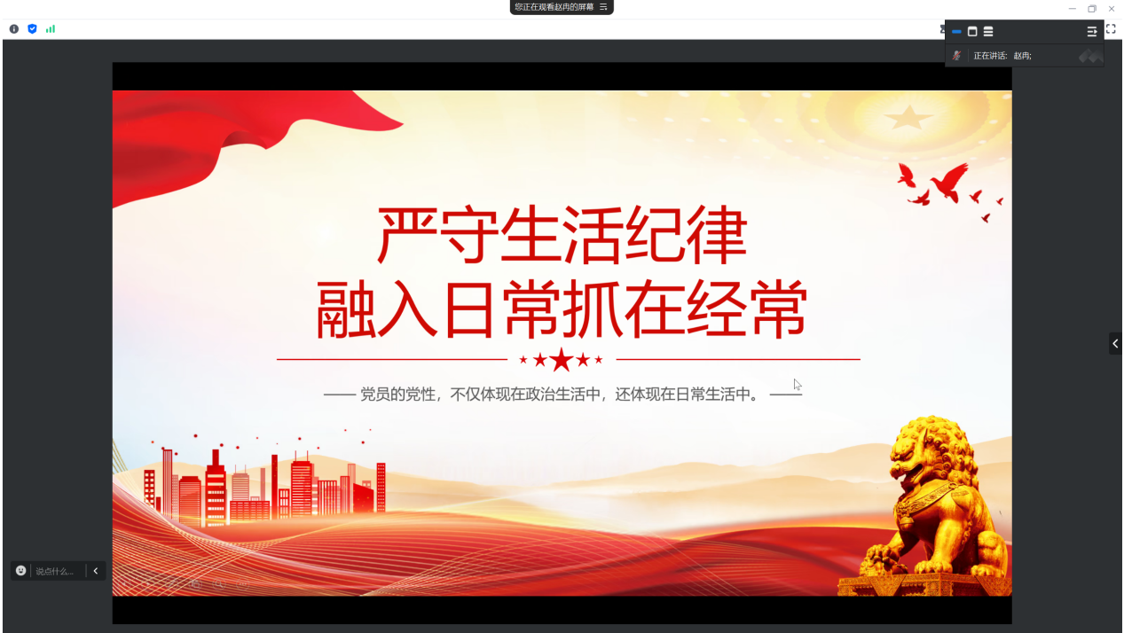 本科生第一、二、三党支部召开主题为《把纪律教育融入平常抓在日常》的线上学习党日活动,会议由分党校秘书长赵冉主持,全体党员参加。